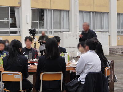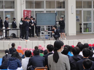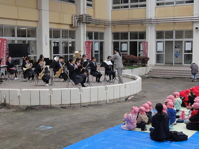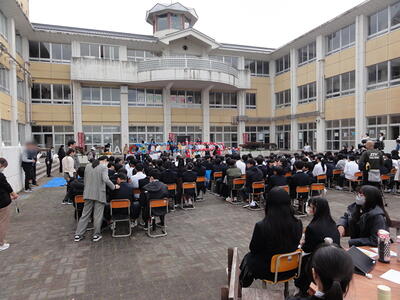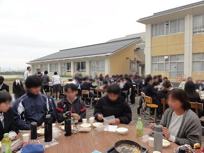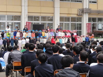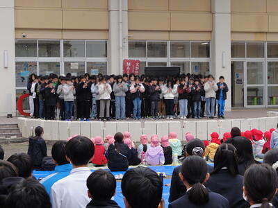 11月13日、第4回収穫感謝祭を中庭と農園で開催しました。こども園・保育園の園児や、小学生、保護者、地域の方、学校ボランティアの方をお招きしました。園児、児童からの合唱や合奏、吹奏楽部からの演奏を披露し合い、全員合唱では素晴らしい歌声でした。米中農園で収穫したさつまいもを使用した焼き芋や、焼きそばを振る舞い、地域の方に感謝の気持ちを伝えました。第二部では三年生の子どもたちが地域の方と意見交流会を行いました。収穫感謝祭の感想やこれからの地域連携について、活発な交流会ができました。子どもたち、保護者、地域の方が一体となり、和気藹々とした雰囲気となりました。